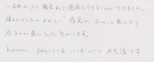 一年半ぶりに機会あって施術を受ける事ができました。体のバランスがおかしい感覚がスーッと楽になり座るのが楽になった気がします。それにしてもいつもながら不思議です。